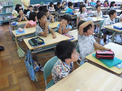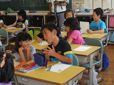 テープ図を工夫して書いて、かくれた数を求める学習をしていました。子どもたちの疑問を大切にしながら、それを取り上げてペアで話し合う活動を多く取り入れながら学習を進めていました。子どもたちはとてもよい表情で、隣の子と考えを交流していました。