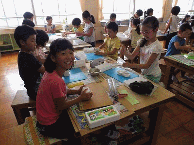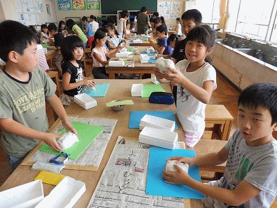 図工の授業の様子です。写真は、粘土を直方体(箱)の形に整えているところです。できた直方体を、切ったり、かき出したり、部品をくっつけたりして、様々な形を造っていくようです。