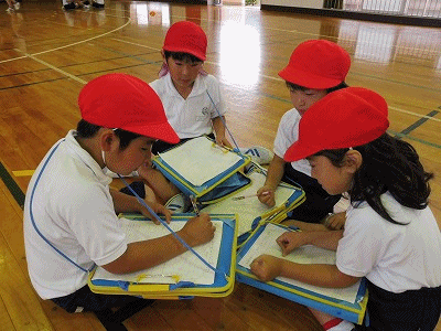 ボール運動 〜2年生〜 公開日 2017/06/21 更新日 2017/06/21 2年生の部屋 元気のよいかけ声で準備運動をした後、グループごとに攻める作戦を考えていました。その後、ドッジボールのゲームをしました。考えた作戦通りにできたのかな・・・?