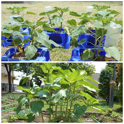 3年生が育てているひまわり。一人一人は植木鉢でミニひまわりを育てています。農園では、大きく成長するロシアひまわりが大きく大きくなってきました。はやく花が咲かないかなぁ。