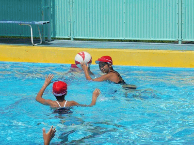 6年生は水球のようなゲームをしていました。ボールを拾ったり、投げたり、捕ったりするのも、地上のようにはいきません。でも、そこが面白いのかも知れません。担任の先生も一緒になって、ボールゲームを楽しんでいました。