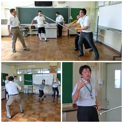 8月24日(木)の午後からは、小牧警察署の方3人を講師に迎え不審者対策について学びました。メインはさすまたの使い方です。不審者に見立てた人に対して、さすまたをどのように使うかを実際にやってみました。「備えあれば憂いなし」万が一の事態に備えた研修です。