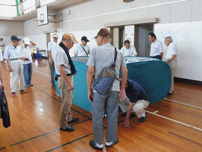 小木小学校避難所運営連絡会主催の第2回目となる訓練が、8月27日(日)の午前中に小木小学校の体育館で行われました。小木小学校区の6地区から約80名の参加者がありました。参加された方たちは、ワンタッチパーティションの設置や簡易トイレの設置、起震車体験など4つの訓練を順次体験していきました。