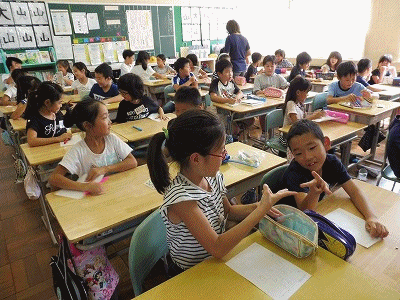 英語活動 3年生 公開日 2017/09/04 更新日 2017/09/04 3年生の部屋 1〜12までの数字の言い方を、ゲーム形式で学んでいました。自分が紙に書いた数字を、相手より早く全部消した方が勝ちというゲームのようです。とっても楽しそうに活動していました。
