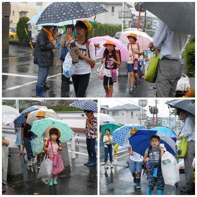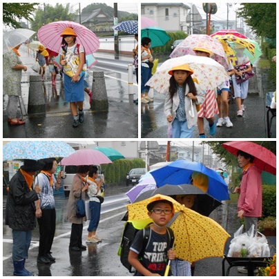 今日は雨で、子どもたちも手にいっぱいの荷物、そして傘を持っての登校です。また、今日は廃食用油の回収日でもあり、小牧女性の会の皆さんも正門前であいさつ運動を行いました。