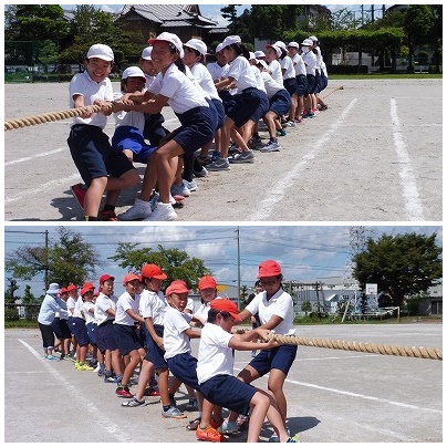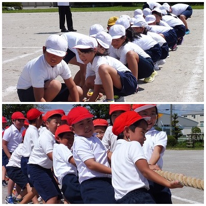 4〜6年生は親子で綱引きをします。今日は時間がなかったので、ほんのわずかな時間しか綱を引かなかったのでどちらが優勢かわかりませんでした。体力、持久力の勝負になりそうです。