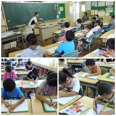 この日は2年2組の子どもたちが、図工の授業で初めてカッターナイフを使いました。担任の先生が悪いお手本を示すと「あぶない」「こわい」等の声が上がり、緊張感を持って話を聞いていることがわかりました。