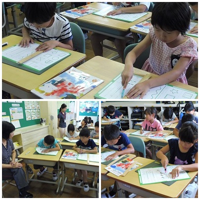 カッターナイフの使い方の説明後、練習用の紙をもらい実際に切ってみました。しかし、多くの子が線からはみ出したり、紙がつながったままだったりして、思うようには切れず悪戦苦闘していました。担任の先生から「今日は練習なので上手に切れなくても大丈夫だよ」という言葉をかけられ、子どもたちは安心していました。