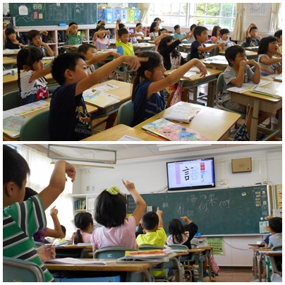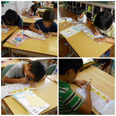 モニターに映った漢字の筆順をまねながら、指で書いて練習します。その後、漢字ドリルで実際に書いて練習です。きれいにまとまった字が書けているかな?
