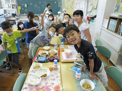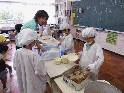 今日のメニューは、豆腐のたまごとじ、鶏肉の甘酢あんかけ、ごはん、牛乳、冷凍みかんでした。給食当番はてきぱきと仕事をしています。すばらしい!