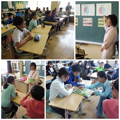 6年生では、朝ご飯に関する内容でした。事前にクラスで取ったアンケート結果を基に、赤・黄・緑の食品をバランスよく食べることが大切だと教えていただきました。