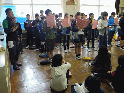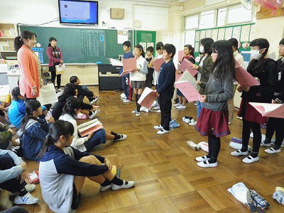 本日も外部講師の五十君先生に来ていただき、6年生の指導をしていただきました。今日が2回目になります。最初は向かい合ってパートごとに練習をし、次に合唱をしました。最初は自信がないのか声があまり出ませんでしたが、少しずつ自信をつけて大きな声が出るようになりました。