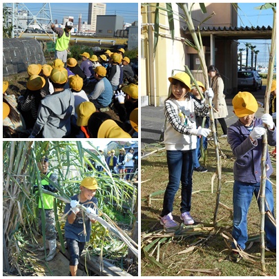 今年もサトウキビ収穫を行いました。いつもお世話になっている関戸さん、林さん、そして尾張中央農協の方に手伝ってもらっての収穫。長さ3mぐらいのサトウキビを学校まで運んで、皮をむきました。