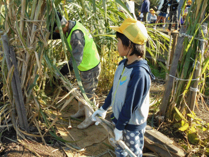 その後、絞る機械にサトウキビを入れると、サトウキビジュースのできあがりです。とても甘かったです。この大きさに成長するまで6ヶ月かかるそうです。いつも世話をしてくれた関戸さん、林さん、ありがとうございました。今年は、一人一本ずつ家に持ち帰りました。