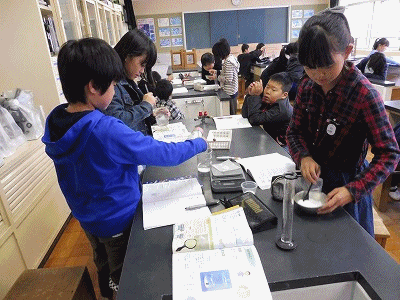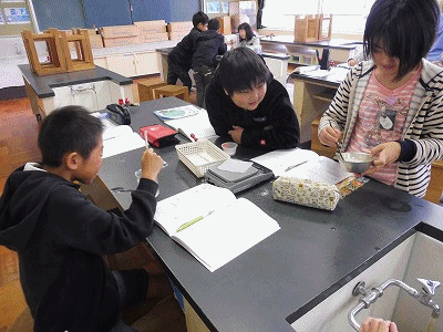 理科の学習の様子です。食塩やミョウバンを水に溶かし、どれだけとけるのかを調べていました。