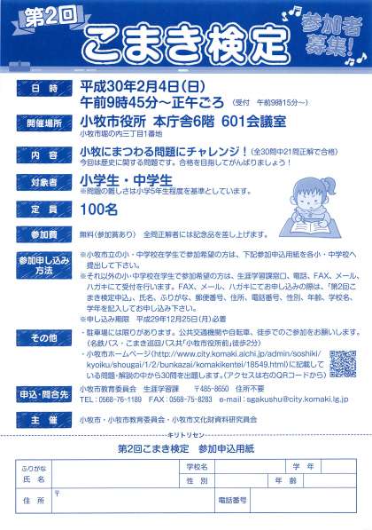 第2回こまき検定 参加者募集! 公開日 2017/12/20 更新日 2017/12/20 学校生活の部屋 「こまき検定」の参加者募集中です。小牧市の歴史について詳しく知るチャンスです。昨年度の問題や今回の参考問題が、小牧市のホームページに載っています。一度見てください。申込み用紙は、学校にありますので担任まで連絡をお願いします。 締切日が平成30年1月19日(金)まで延長されました。ぜひ、参加をしてみましょう。 ※問題は歴史に関することが中心で、四択になります。
