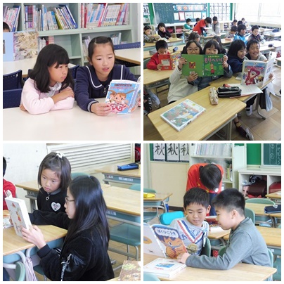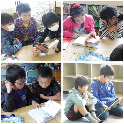 なかよし読書1 公開日 2017/11/20 更新日 2017/11/20 学校生活の部屋 読書の秋にちなんで、本日「なかよし読書」を行いました。 1年生と6年生、2年生と5年生、3年生と4年生がペアとなり、上級生が下級生に読み聞かせをします。 頭を寄せ合って本をのぞき込む、ほほえましい様子がたくさん見られました。