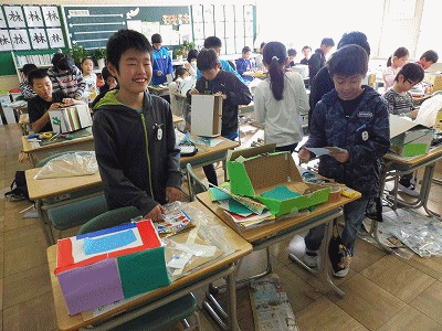 飾りつけなども進み、完成に近づいているようです。アイディアいっぱいのユニークな箱がたくさんできあがっていました。