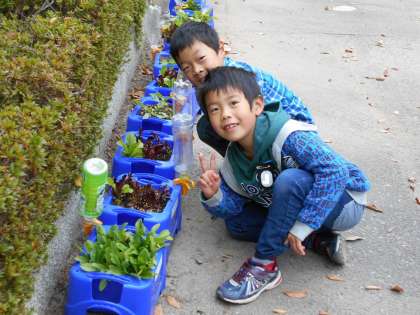 2年生がたねを蒔いて育てている野菜が、大きく成長してします。リーフレタス、水菜、ほうれん草など、すでに何回も収穫して食べている子もいます。毎朝、子どもたちは観察や水やりをして、大きくなるのを楽しみにしています。