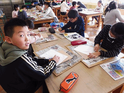 図工の授業の様子です。版画の下絵を描いていました。自分が何かをしているところを描いているようです。顔の表情がよく分かるように、目・鼻・口などを大きく描くように先生からアドバイスをもらっていました。