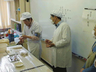 教職員研修の一つとして、おまんじゅうづくりを体験しました。ものづくりマイスターの野呂先生においでいただき、職人の技を実際に見せていただきながら、おまんじゅう作りの方法を教えていただきました。プロが作るのを見ていると簡単そうですが、実際に作ってみるとなかなかうまくいきません。悪戦苦闘しながらも3種類のおまんじゅうを完成させました。つくった後にはおなかも満たされ、とても楽しい研修となりました。