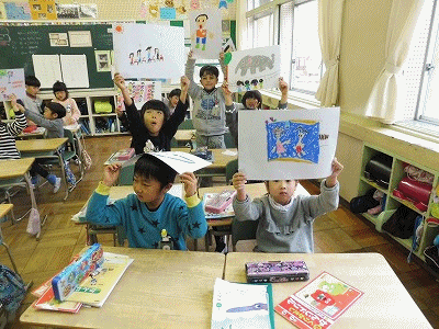 思い出発表会に向けて(1年生) 公開日 2018/01/17 更新日 2018/01/17 1年生の部屋 学校公開日に行う「一年間を振り返ろう(思い出発表会)」の練習をしていました。それぞれが描いた思い出の絵を持って、写真を撮りました。「はい、ポーズ!」