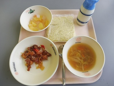 しょうゆラーメン(中華めん)、鶏肉の甘酢がらめ、アセロラゼリーあえ、牛乳