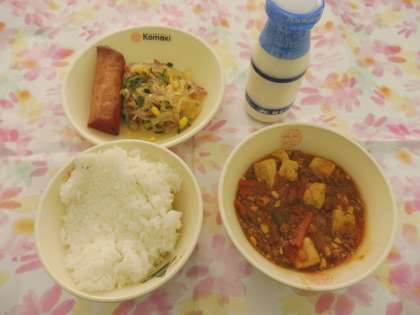 こんだて ごはん、マーボー豆腐、愛知の野菜春巻き、バンサンスー、牛乳 野菜たっぷりのメニューでした。