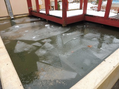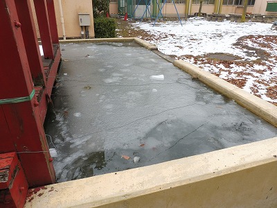 昨日ちらついた雪の影響もあって運動場の状態が悪く、今日もなわとび集会が延期になってしまいました。先週から引き続き厳しい寒さが続いています。中庭の池も、表面はけっこう凍っていました。