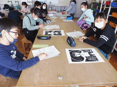 図工の様子(4年生) 公開日 2018/01/31 更新日 2018/01/31 4年生の部屋 今日はインクを塗って版画を完成させました。木版画をするのは今回が初めてだそうです。初めてにしては、どの子も上手にできていました。