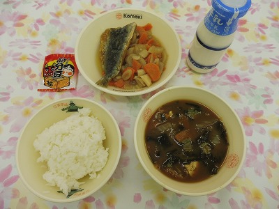 ごはん、みそ汁、いわしのかばやき、根菜の煮もの、節分豆、牛乳