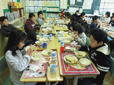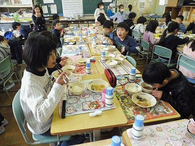 下の写真は3年1組の様子です。健康でしあわせな一年にできるよう残さずに食べました。