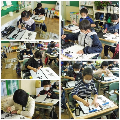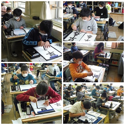 書写の時間(4年生) 公開日 2018/02/01 更新日 2018/02/01 4年生の部屋 課題は「早春」。 文字の大きさや中心に気をつけて書きました。どの子も真剣なまなざしで、すずりに向かっていました。