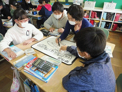 各グループにホワイトボードが1枚配られ、問題の関係を線分図等に表して答えを求めようとしています。問題の関係を「早く、簡単に、正確に」図に表現できる力はとても大切です。小木小学校ではこの力をつけるために、関係を絵や図に表すことに低学年から取り組んでいます。