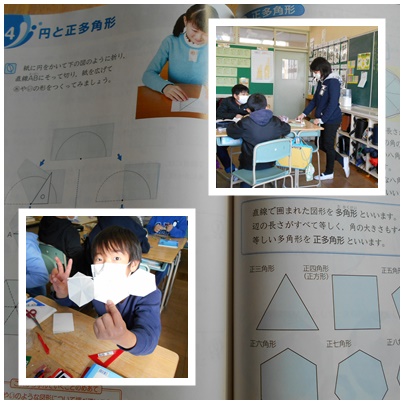 5年生の算数「円と正多角形」で、実際に円から正六角形や正八角形を作って、角の大きさなどを調べました。