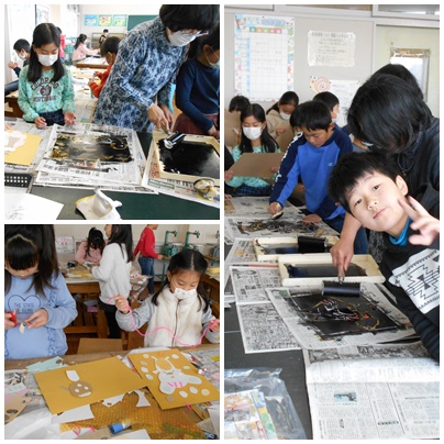 図工の様子(3年生) 公開日 2018/02/13 更新日 2018/02/13 3年生の部屋 3年生の図工「いろいろうつして」で版画にチャレンジです。 紙や毛糸などいろいろな材料で絵を作り、版画を作成しています。