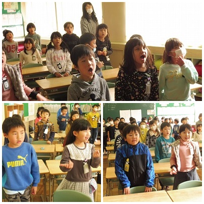 1・2組合同で卒業生を送る会に歌う歌の練習をしていました。歌っているのは、ある歌の替え歌のようです。6年生にありがとうの気持ちが伝わるように、一生懸命歌っています。どんな歌か楽しみにしていてください。