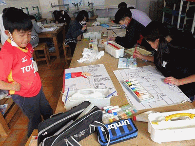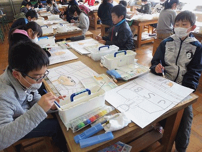 わすれられないあの時(4年生) 公開日 2018/02/14 更新日 2018/02/14 4年生の部屋 図工の時間の様子です。思い出の場面を絵に表しています。今日から彩色が始まりました。まずは、顔の肌色から塗り始めています。