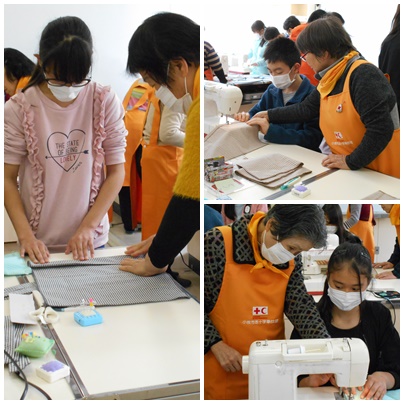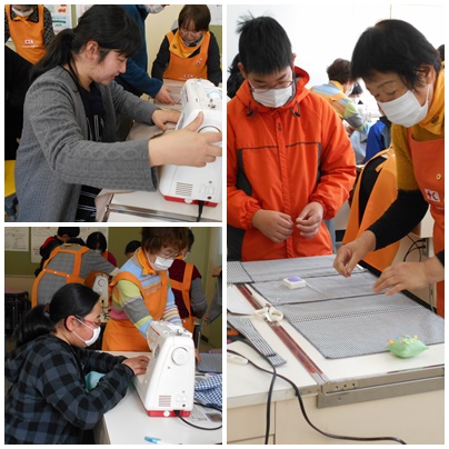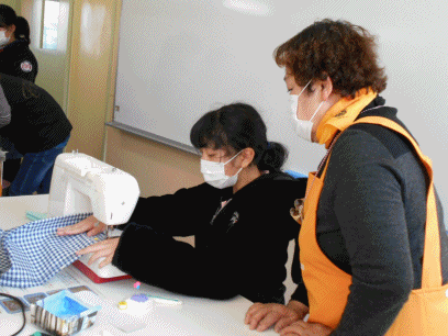 小牧女性の会の皆さんに丁寧に教えてもらいながら、ミシンを上手に扱って作っていきます。小牧女性の会の皆さん、本当にありがとうございました。