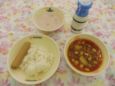 ごはん、チリコンカーン、フランクフルト、いちごババロア、牛乳