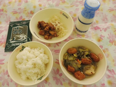 ごはん、よせなべ、手巻きごはん(鶏肉のあまだれかけ・せん切りたくわん・手巻きのり)、牛乳
