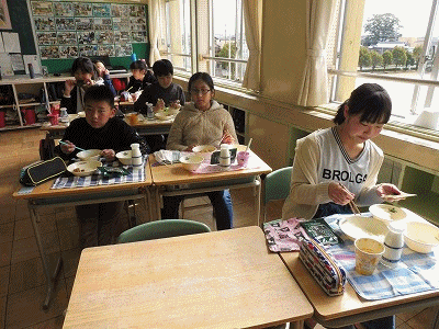 下の写真は6年2組の様子です。このクラスもインフルエンザ等が拡がらないように、全員前を向いてを食べています。