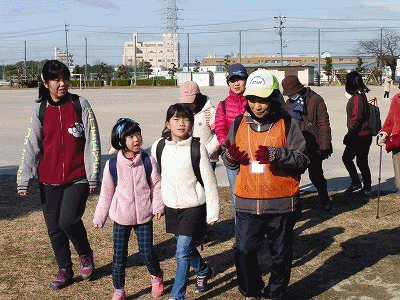 晴天にはなりましたが、風が冷たい日となりました。9時に全員集合して準備運動をしました。準備運動の際、大人からは「あっ、膝が痛い」なんて声も聞こえてきましたが、全員元気よく出発していきました。