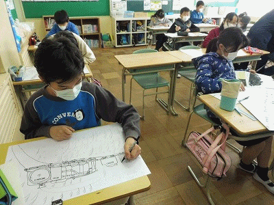 宮沢賢治作「銀河鉄道の夜」を聞いて、思い浮かぶ情景を絵に描いています。聞き慣れない言葉がたくさん出てくるお話を聞いて、子どもたちはどんな世界を思い浮かべるのでしょうか・・・?