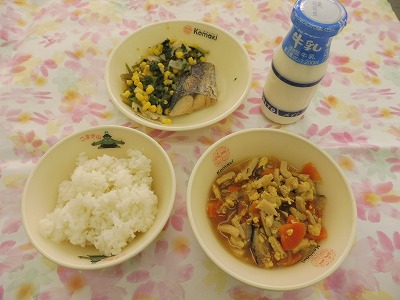 ごはん、高野豆腐の卵とじ、さわらのごまだれかけ、くきわかめのサラダ(和風ドレッシング)、牛乳