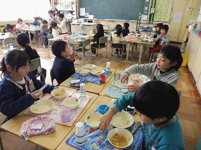 下の写真は1年1組の様子です。訪問するのが遅くなってしまい、ごちそうさまをするところだったので、食べている様子があまり撮れませんでした。