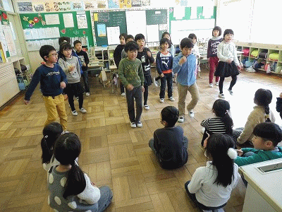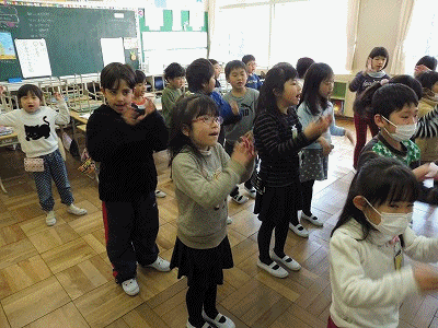 卒業生を送る会の練習(1年生) 公開日 2018/02/20 更新日 2018/02/20 1年生の部屋 1年2組が送る会に向けての歌練習をしていました。歌に合せてかわいい振付がついています。6年生の皆さん、楽しみにしていてください。