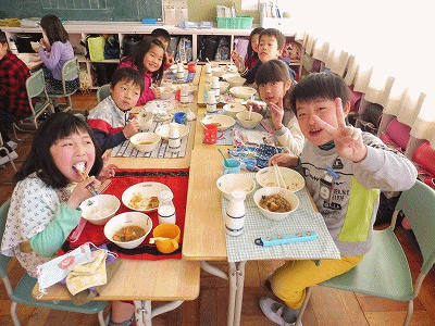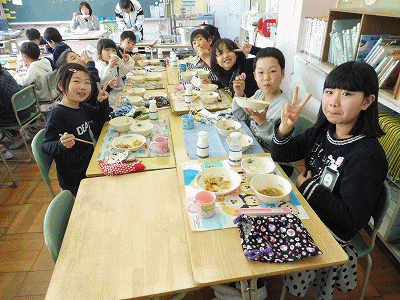 下の写真は2年1組の様子です。いつもはにぎやかな?2年1組ですが、今日は昼の放送をよく聞いて、静かに食べていました。