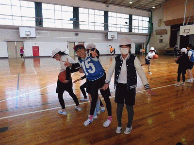 バスケットボールの様子です。ゲーム前のウォーミングアップをしているそうです。ボールを受け取ったら、ボールを腰のあたりで何回か回し、ドリブルしてゴール下へ行きます。そしてシュート。シュートを決めたらまたドリブルして戻り、次の人にタッチをします。ルールが明確で、グループで競い合っているので、とっても盛り上がっています。