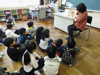 写真下は美音子先生の読み聞かせを聴く1年生の様子です。